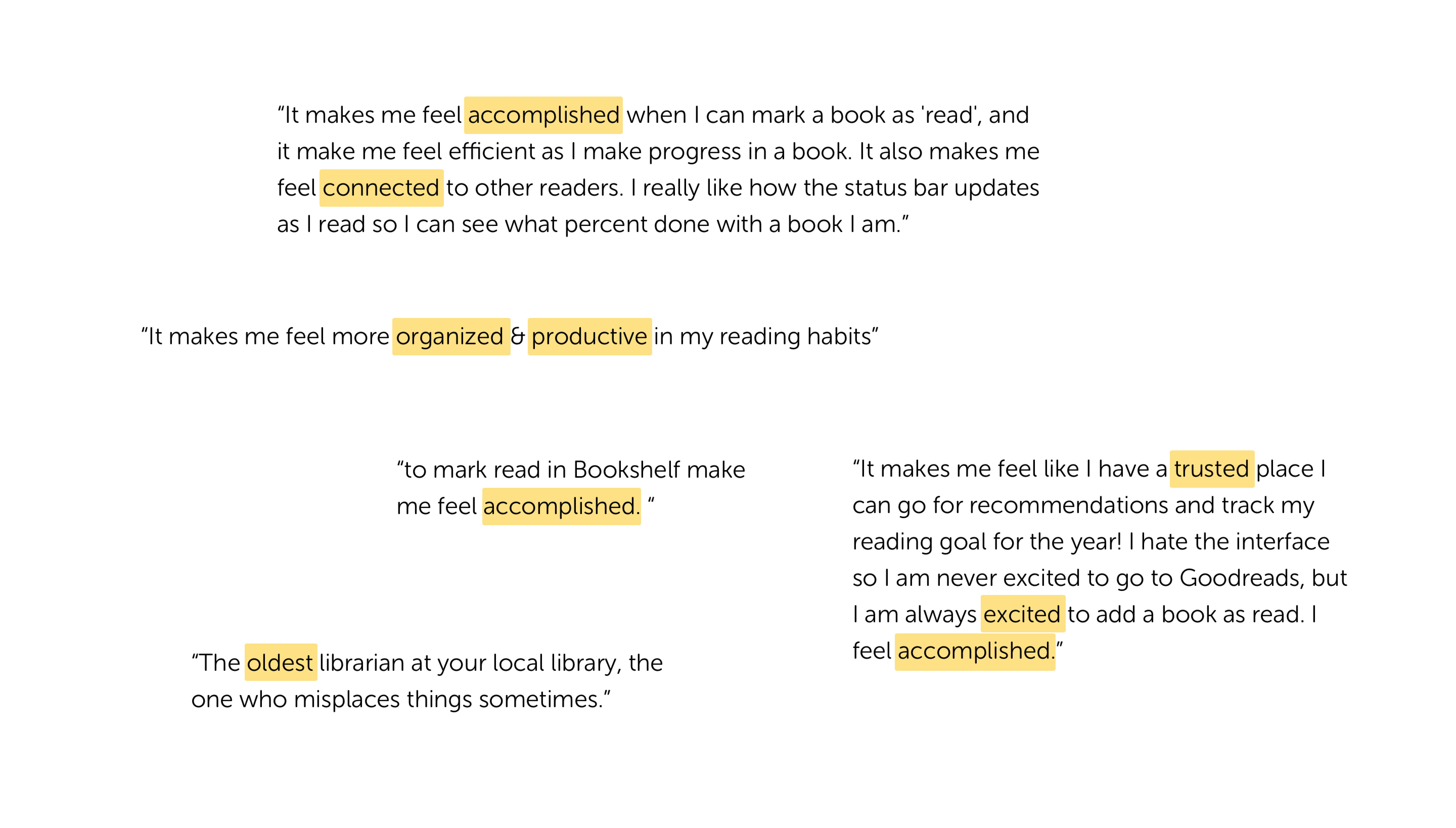 One of my projects involves re-designing a social cataloging web application for books. I conducted interviews with users of one of the more popular social book cataloging web apps with a focus on emotions. I picked the key adjectives my interviewees used to describe their experience, then used these words as a starting point to create some “visual personas”.