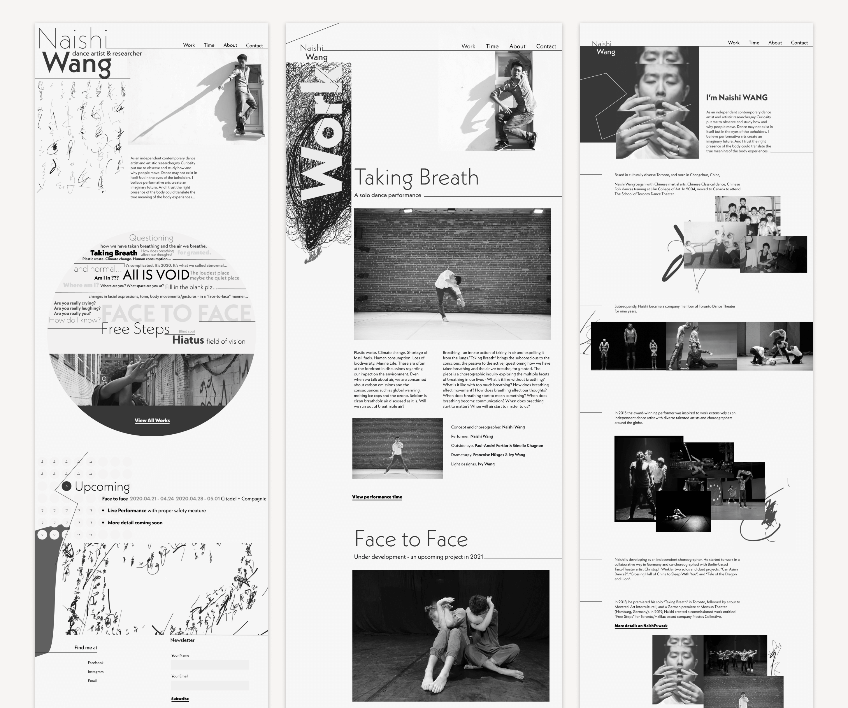 In my recent work designing a website for a dance artist. I was able to be much more creative on the visual language and layouts. You might say that it was easier to lose the connection in-between pages when layouts were different. However, It serves the idea of the dancer’s continuous movements and the desire to be unique and free, which was the priority goal for the design.