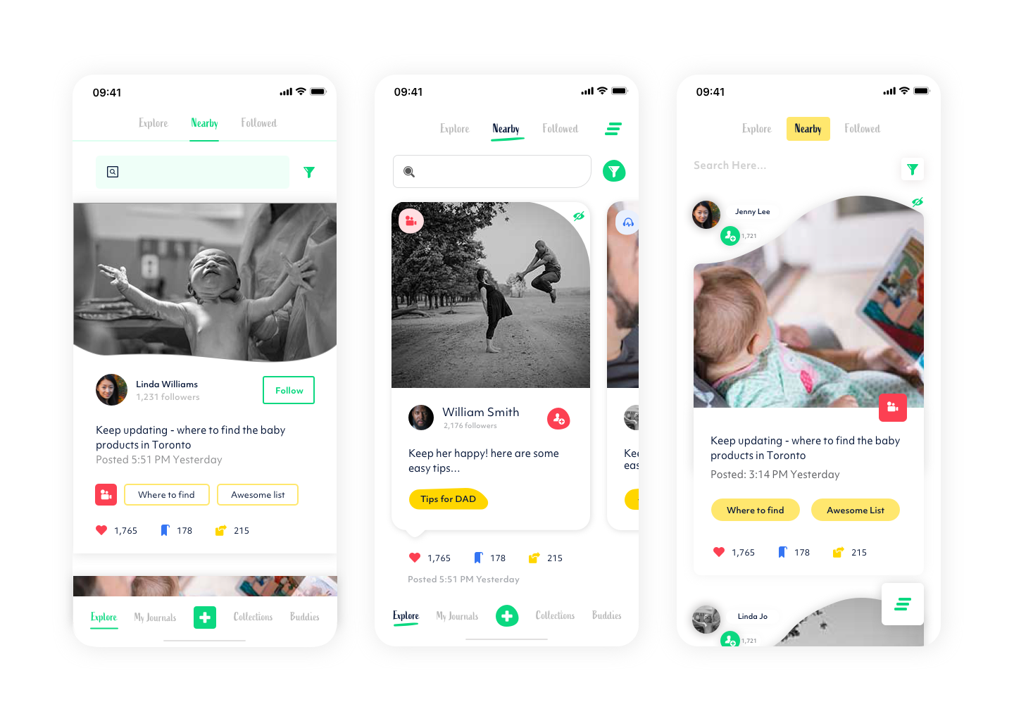 Building style tiles could be driven by different goals and purposes. Another project I embarked on was designing a social app for expecting parents. This round of creation focused on exploring shapes, fonts and colors that could generate a playful and informal visual direction to relax the customers.