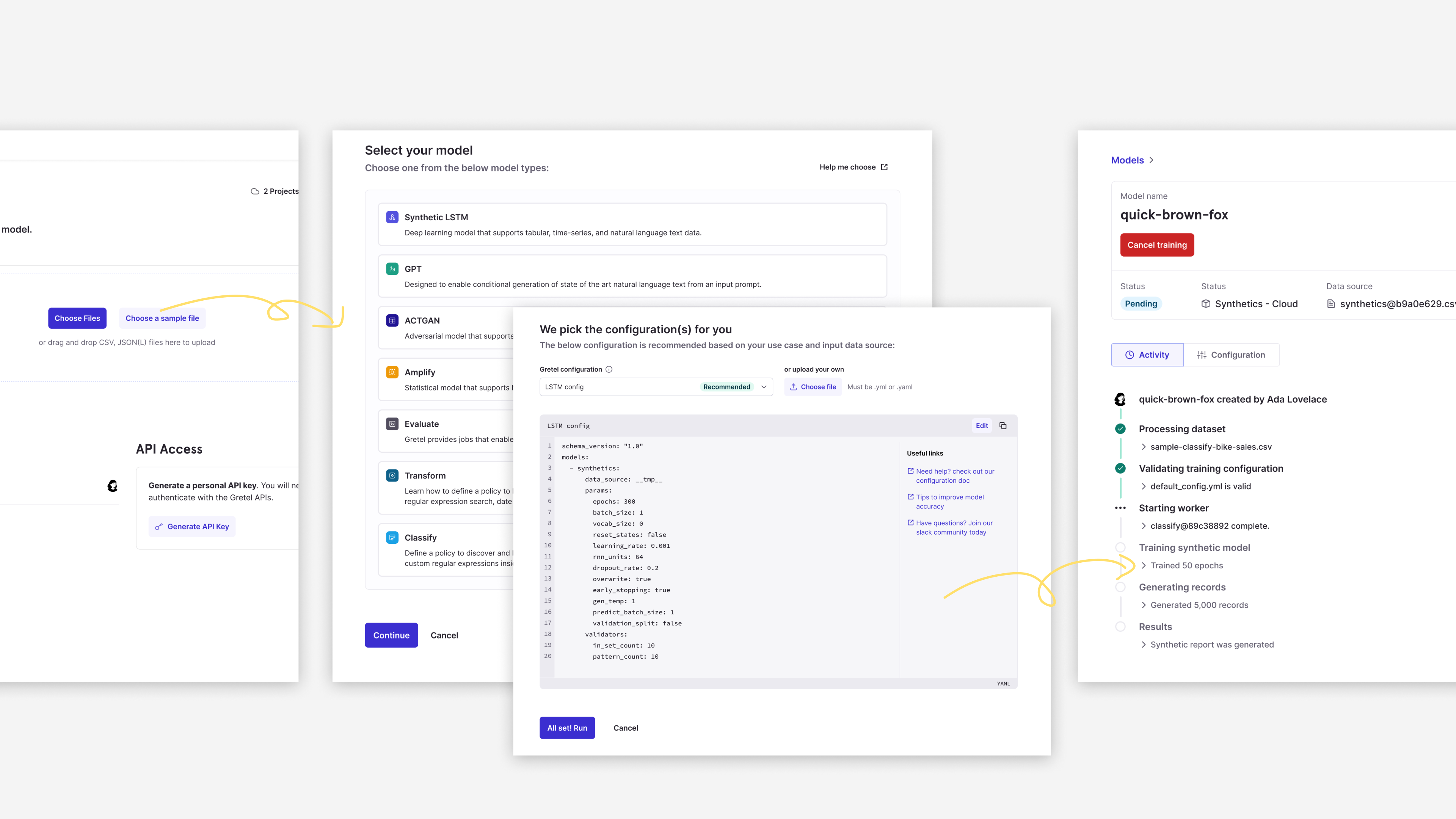 Our existing synthetic data generation process allowed users to generate large amounts of tabular data using different AI models (high-dimensional, time series, GPT-based models, etc.). The workflow was as follows: