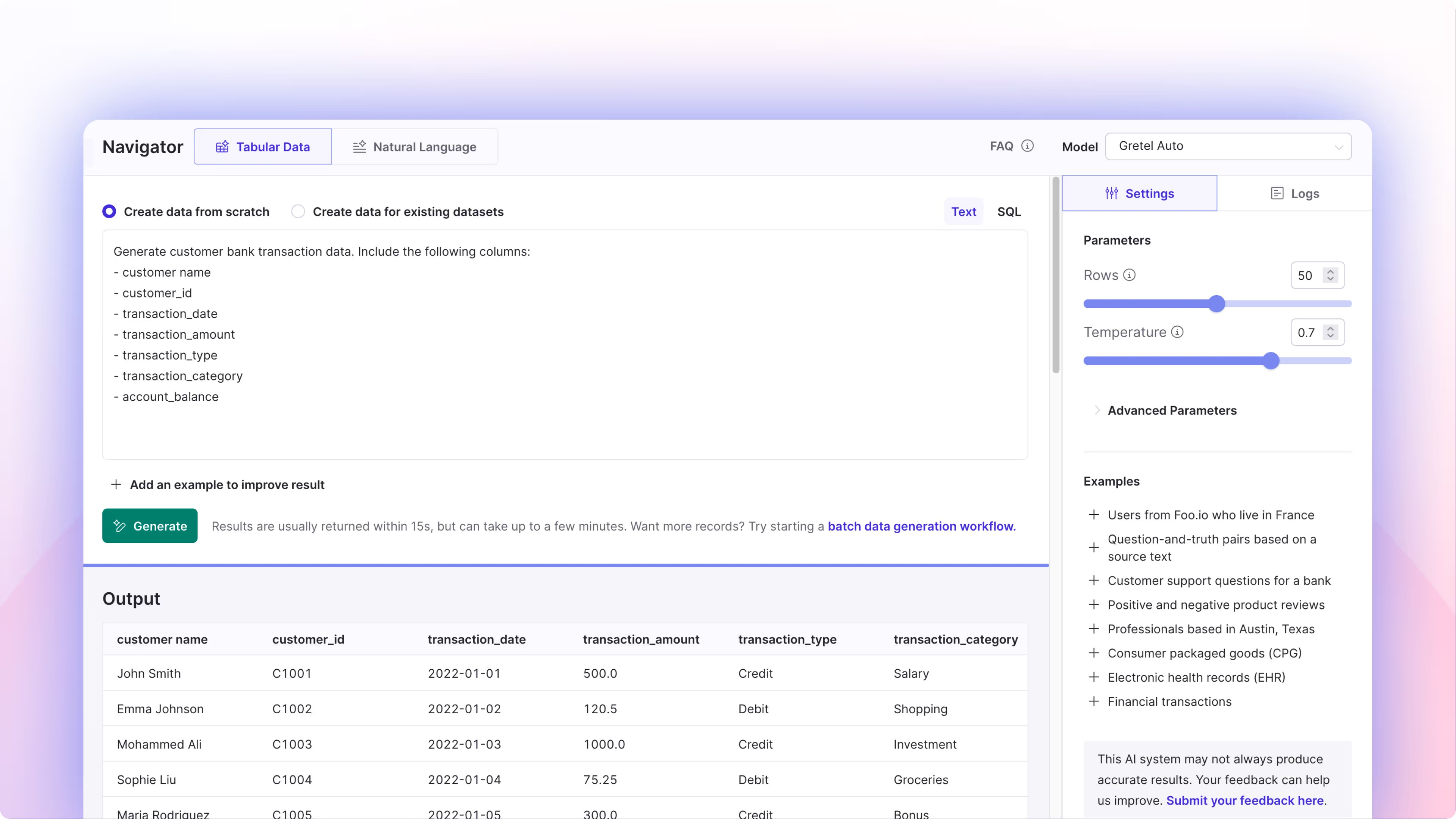 The product, Gretel Navigator, is the first compound AI system designed to create, edit, and augment tabular data. Unlike traditional batch synthetic data generation, Gretel Navigator enables users to iteratively build datasets from scratch with a more interactive and intuitive process.