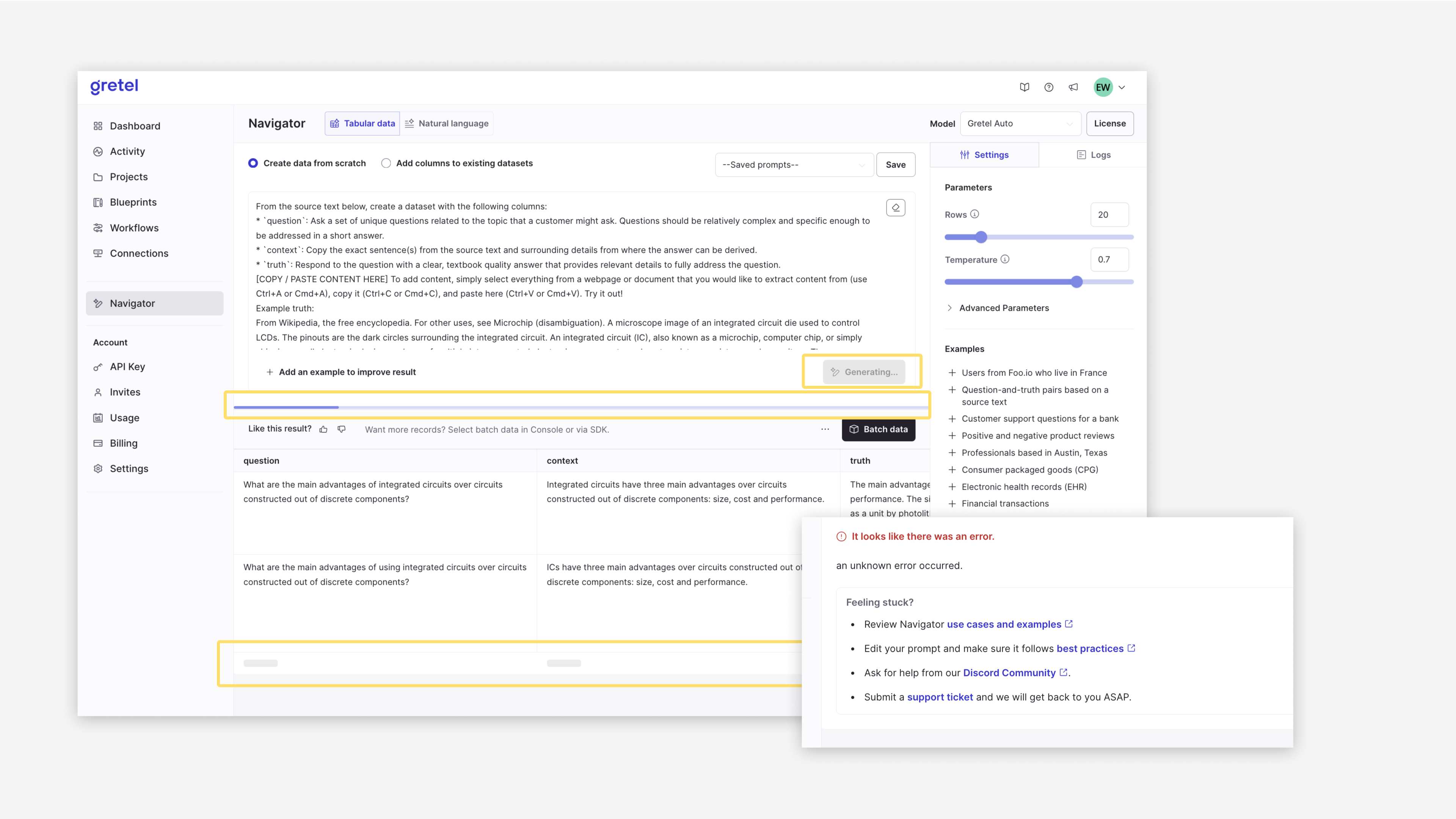 Gretel Navigator is the first generative AI platform for tabular data, enabling users to create and refine datasets interactively using prompts and real-time feedback. With no existing design patterns to reference, I developed a new research approach based on expert interviews and assumption tracking to simplify complex AI processes. Through rapid prototyping and user testing, I created an intuitive, accessible platform that significantly improved user engagement and adoption.