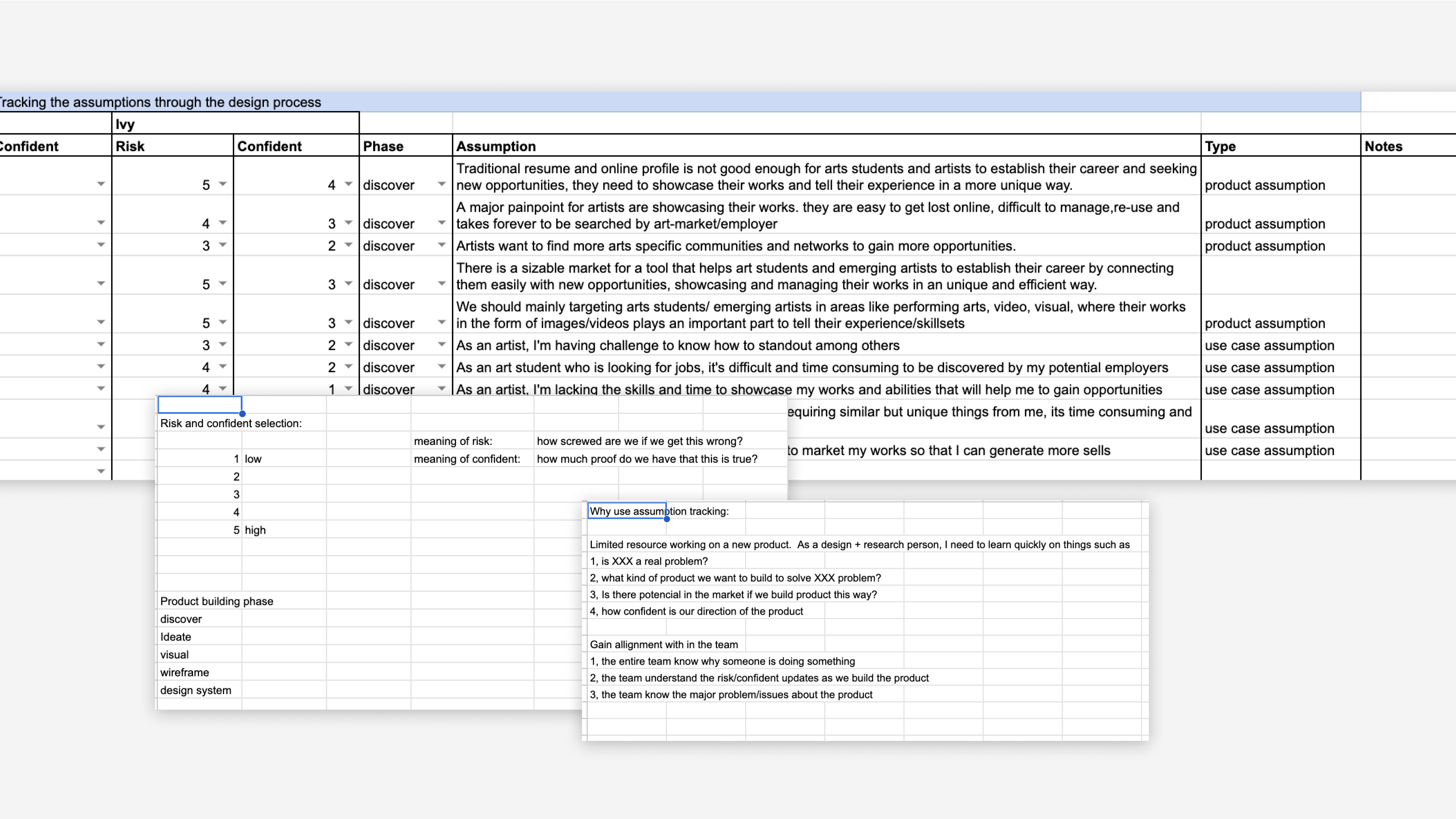With no existing precedent to rely on, team members often had different perspectives based on their specific domain expertise. To prevent lengthy debates, we used assumption tracking as a structured way to test and resolve conflicting ideas quickly.